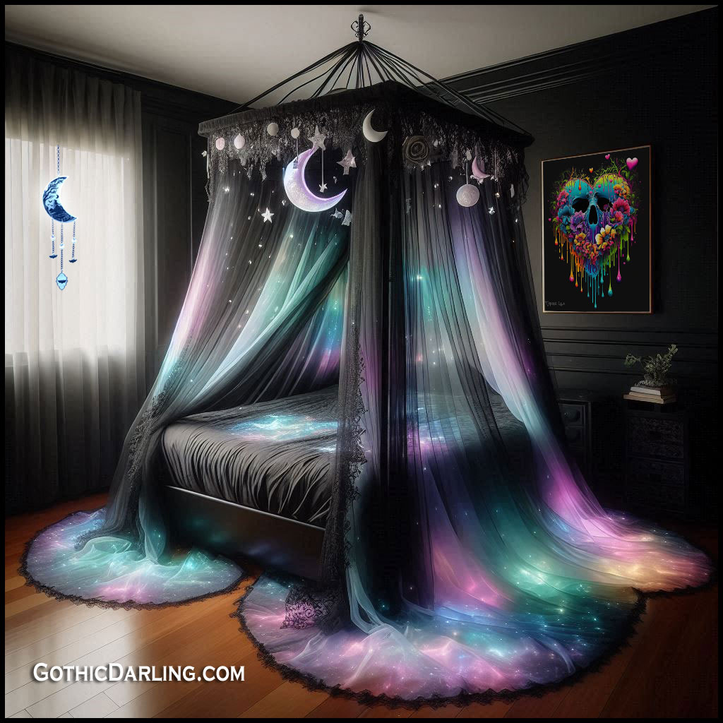 Whether your style is elegant, spooky, or celestial, a canopy bed becomes the foundation of your entire room.