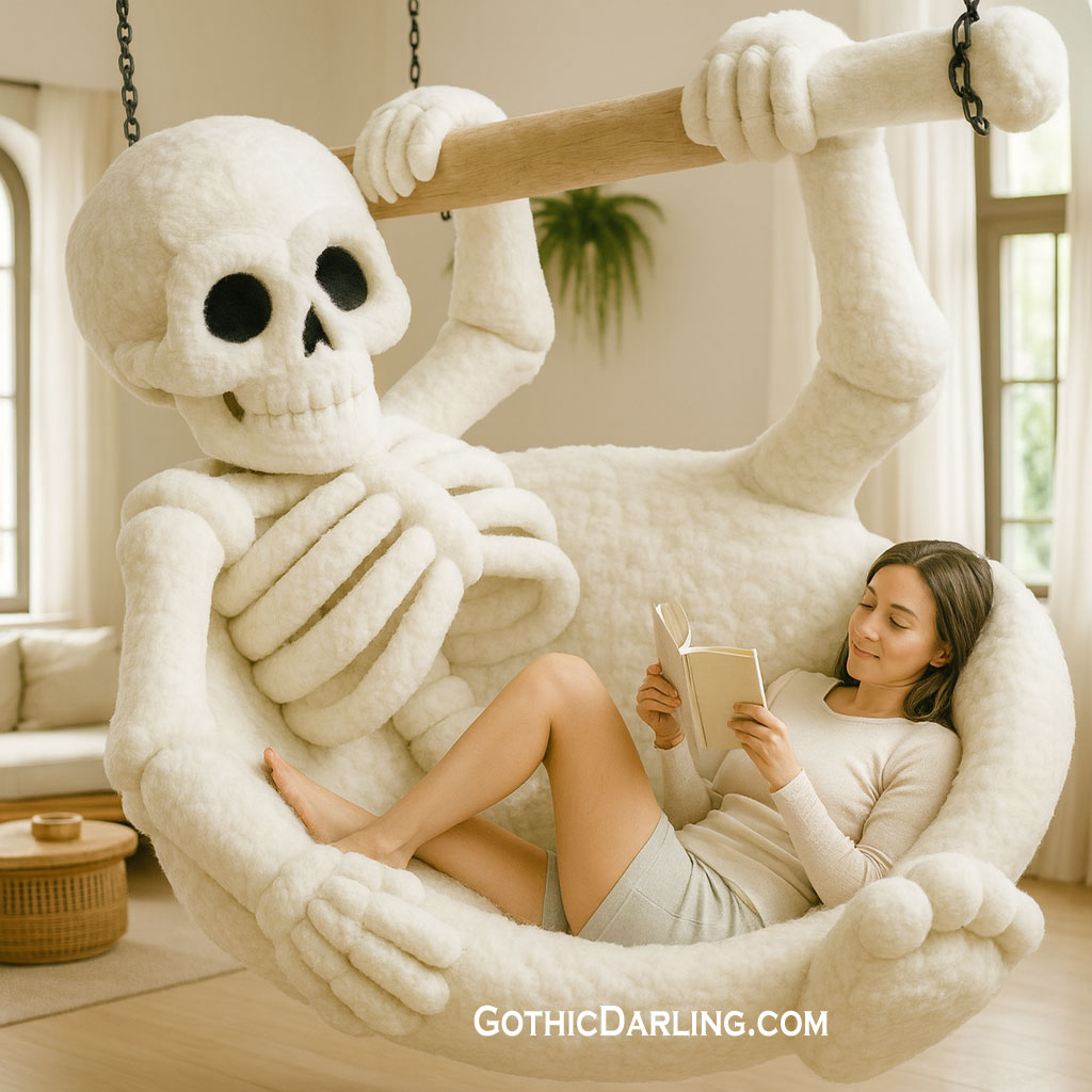 It’s the kind of furniture piece that instantly transforms a space into a gothic sanctuary. Picture swinging gently while sipping coffee, reading tarot cards, or simply enjoying a peaceful moment in the company of your plush skeleton friend.