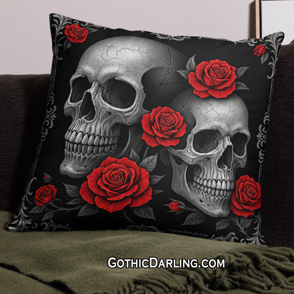 This pillow features my original artwork: intricate skulls intertwined with deep red roses, blooming against a rich black background. The contrast is powerful—representing life, death, passion, and mystery all at once. It’s that irresistible gothic combination of romance and darkness that makes your décor feel both enchanting and meaningful.