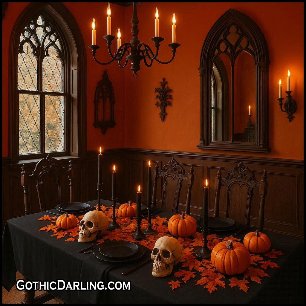 Gothic elegance thrives on candlelight. Replace overhead lighting with flickering black taper candles in ornate silver or wrought-iron candleholders. You can also mix in LED flameless candles for safety, especially if your feast runs late into the night.