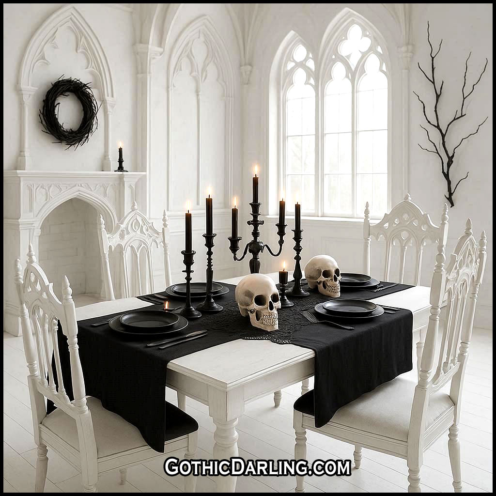 Setting up a gothic dining room is easy and super fun. With black plates, gothic silverware, skull wine glasses, and spooky decorations, you can create a dark and beautiful space that feels perfect for every meal. Just mix dark colors, candles, and cool designs to make your dining room feel like your own gothic castle.