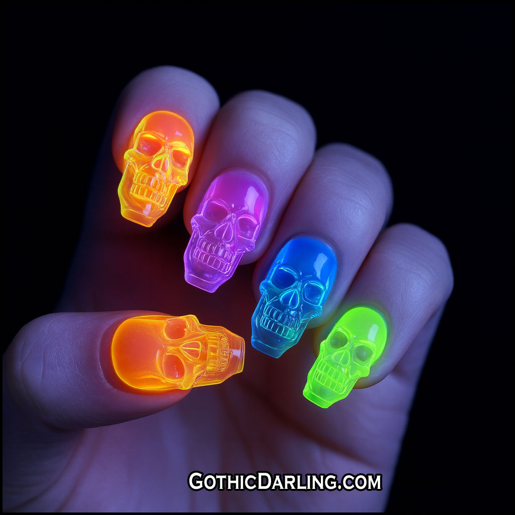 Under regular lighting, the colors pop with a striking, edgy beauty—but once the lights go down, the skulls glow with an eerie neon radiance that transforms your nails into a spooky rainbow light show.
