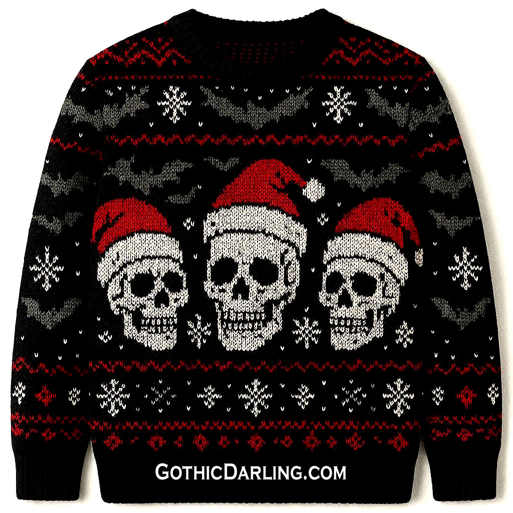 Gothic Christmas sweaters are proof that the holidays don’t have to be all candy canes, elves, and neon cheer—there’s plenty of room for some Goth Fashion. These sweaters take the classic “ugly Christmas sweater” tradition and transform it into something beautifully haunting.