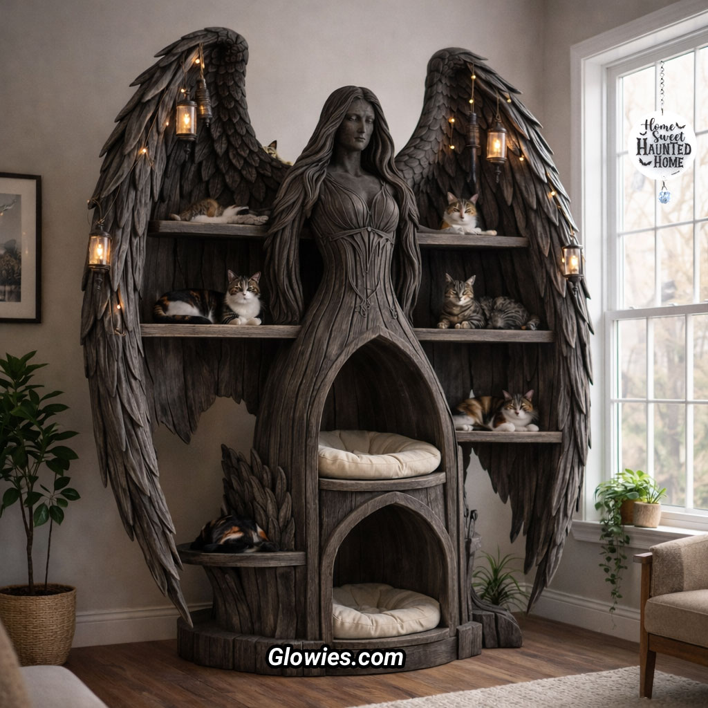 Designed with cats in mind, the Guardian Angel offers multiple integrated playhouses, cozy beds, and elevated climbing spaces that encourage rest, exploration, and comfort. Cats can curl up to sleep beneath protective wings or climb to higher perches to observe their surroundings, all while surrounded by a sense of calm and shelter. Perfect for gothic interiors and luxury pet lovers, this piece blends beauty, symbolism, and practicality into one unforgettable centerpiece.